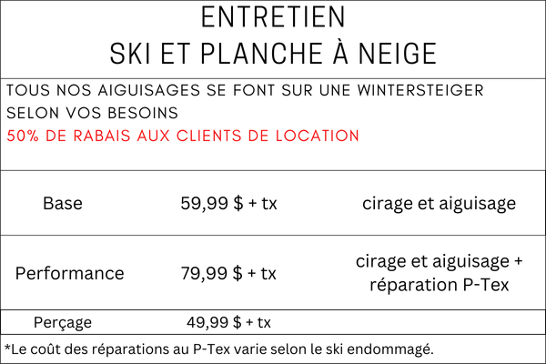 Le forfait performance est parfait pour ceux qui souhaitent aiguiser et farter leurs skis ou snowboards pour en début et au cours de la saison. Tandis que le forfait Course est